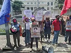On August 10, 2022, groups such as Kilusang Mayo Uno, GABRIELA, and SCMP conducted a mobilization in front of Supreme Court in support of the loved ones and colleagues of missing activists as they urged the issuance of writ of amparo. The activists, Loi Magbanua, Ador Juat, Elgene Mungcal, and Cha Pampoza, have been believed to be abducted by government forces and being held in a military camp.[23] Similar groups earlier protested in front of Camp Aguinaldo in July to call to "surface" the said missing activists.[24]