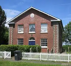 Providence Chapel is a square two-storey building of red and grey/blue brick with some Classical features such as a pediment and pilasters.[5][8][9] The three-bay façade has two sash windows (originally blank recesses)[9] on the ground floor and three above. The ground-floor windows flank a double doorway topped with a rounded fanlight. Above the upper windows is an open-based pediment with pilasters at each side; these are of red brick with wide grey stone quoins.[8][9] The front wall is of red brick; at the side, there are alternate layers of red and glazed grey/blue bricks.[5][8][9] The pediment has a circular stone motif bearing the text providence chapel, 1849 and j.h.| m. (referring to "James Hallett, Minister", who led the congregation at the time the chapel opened).[8]
