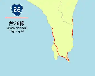 Provincial Highway 26 is a Taiwanese highway that starts from Fangshan, Pingtung County and ends in Daren, Taitung County. The highway is also known as Ping-E Highway (屏鵝公路) for the stretch between Fangshan and Cape Eluanbi in Kenting National Park, and Jia-E Highway (佳鵝公路) between Cape Eluanbi and Jialeshui (佳樂水). It is the primary highway to Kenting National Park and the beaches in Kenting. The route length is 93.5 kilometres (58.1 mi).[1]