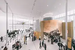 Construction of the new building was completed on August 16, 2016, and the opening date of October 3, 2018, was announced on September 12, 2018.[24][25] The new building is the largest museum in western Canada with more than 7,600 square metres (82,000 sq ft) of exhibition space and 38,900 square metres (419,000 sq ft). The museum features expansive galleries chronicling Alberta's natural and cultural worlds, a feature gallery showcasing travelling exhibitions from Canada and around the world, an interactive, 650 square metres (7,000 sq ft) dedicated children's gallery, and a bigger bug room with live invertebrates and visible nursery. The total cost of the new building and moving is estimated around CAD $375.5 million, with $253 million from the Government of Alberta, and $122.5 million from the federal government Building Canada Fund.[26]