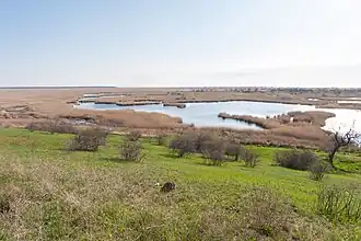 The Pryazovia National Nature Park or Pryazovskyi National Nature Park (Ukrainian: Приазовський національний природний парк) is the second largest national park of Ukraine, covering the estuaries, coastal plains seaside landforms around the Molochna River estuary the Utlyuksky estuary, on the northwest coast of the Sea of Azov in Pryazovia. The area is one of high biodiversity, protecting both steppe and aquatic habitats, and the unique transition zones in between.[1] The wetlands support very large populations of nesting and migratory waterfowl.[2] The park crosses Melitopol Raion and Berdiansk Raion in Zaporizhzhia Oblast.