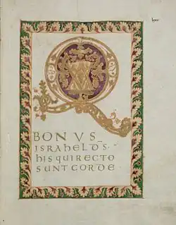 Psalm 73 is the 73rd psalm of the Book of Psalms, beginning in English in the King James Version: "Truly God is good to Israel". In the slightly different numbering system used in the Greek Septuagint and Latin Vulgate translations of the Bible, this psalm is Psalm 72. In Latin, it is known as "Quam bonus Israhel Deus his qui recto sunt corde".[1] Psalm 73 is the opening psalm of Book 3 of the Book of Psalms and the second of the "Psalms of Asaph". It has been categorized as one of the Wisdom Psalms",[2] but some writers are hesitant about using this description because of its "strongly personal tone" and the references in the psalm to the temple (verses 10, his people return here, and 17, the sanctuary of God).[3] The psalm reflects on "the Tragedy of the Wicked, and the Blessedness of Trust in God".[4]