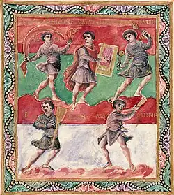 - David and his musicians (f.1v): they play psaltery, cymbals, kithara and strings, with the caption: Quattuor hic socii comitantur in ordine David ("Here four companions accompany David in order")