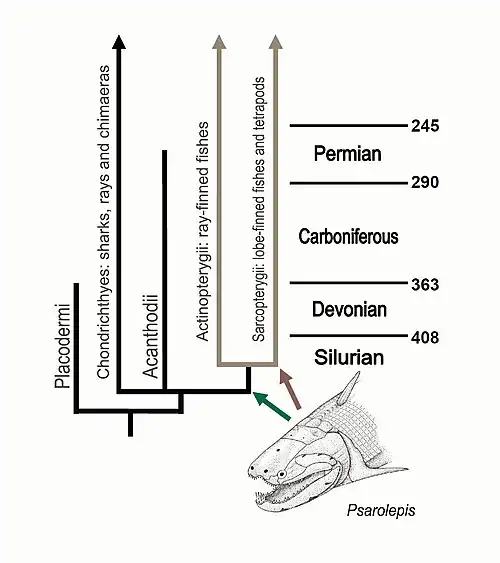 There are some characteristics that bony fish do not have, such as the median spine located behind the head, which is known in sharks and acanthodians, and the pectoral spine extending back from the shoulder girdle which is found in some placoderms and acanthodians.[1] Later, in 2001, Zhu and Schultze gave more basis to the theory that Psarolepis was probably a basal bony fish.[4]