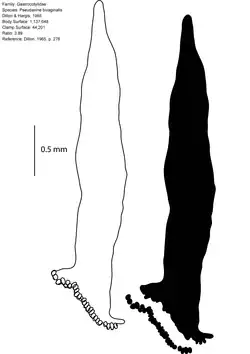 Pseudaxine bivaginalis has the general morphology of all species of Pseudaxine, with an elongate body and an anterior extremity constricted at the level of buccal suckers in most specimens, comprising an anterior part which contains most organs and a posterior part called the haptor. The haptor is asymmetrical, with a laterally directed end (the direction in which the end points, right or left, varies individually, but the internal organs appear to maintain a constant orientation regardless of this variation), and bears 23–34 clamps similar in shape but slightly dissimilar in size, arranged in a single row. The clamps of the haptor attach the animal to the gill of the fish. The extreme of the haptor carries an elongated proboscis-like process called "the terminal lappet", bearing 2 pairs of gastrocotyloid anchors. There are also two buccal suckers at the anterior extremity. The digestive organs include an anterior subterminal mouth, a pharynx, an oesophagus and a posterior intestine that bifurcates near the level of the genital atrium in two lateral branches. The intestinal branches are ramified medially and laterally and are not confluent posteriorly. Each adult contains male and female reproductive organs. The reproductive organs include an anterior genital atrium, armed with 12–14 hooks, a paired vaginae ventrolateral, near the genital atrium, a foldedovary and 12–18 testespost-ovarian, located between the intestinal branches and extend posteriorly to the anterior part of the haptor. Eggs are fusiform, with filaments at both ends.[1][2]