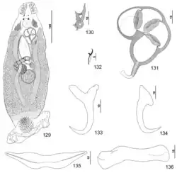 According to Kritsky, Bakenhaster & Adams (2015), Pseudorhabdosynochus mizellei most closely resembles P. williamsi in the basic morphology of the vaginal sclerite and male copulatory organ. In both species, the sclerite has small chambers and the cone of the male copulatory organ is elongate. P. mizellei is easily differentiated from P. williamsi by the deep root of the ventral anchor being shorter than the superficial root and the shaft of the dorsal anchor forming a gentle curve (vs dorsal-anchor shaft comparatively straight in P. williamsi). In addition, the ventral and dorsal bars of P. mizellei are noticeably shorter than those of P. williamsi. P. mizellei differs from P. woodi by having a comparatively small vaginal sclerite with two small chambers. The vaginal sclerite of P. woodi has a larger single ovate chamber.[1]