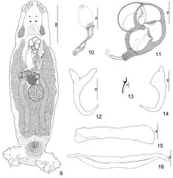 The redescription by Kritsky, Bakenhaster & Adams in 2015 includes the following: Body elongate ovate, flattened dorsoventrally, with slight constriction at level of male copulatory organ (MCO). Numerous tegumental scales with rounded anterior margins extending from posterior ends of intestinal ceca into peduncle. Cephalic region broad, with rounded terminal and two poorly developed bilateral lobes; three bilateral pairs of head organs; pair of bilateral groups of cephalic-gland cells at level of pharynx. Four eyespots lacking lenses immediately anterior to pharynx; members of posterior pair larger, equidistant or slightly closer together than those of anterior pair; accessory chromatic granules small, irregular in outline, uncommon or absent in cephalic region. Pharynx ovate, muscular; esophagus short to nonexistent; intestinal ceca blind, extending posteriorly to level of peduncle. Peduncle broad, tapering posteriorly. Haptor subtrapezoidal, with dorsal and ventral anteromedial lobes containing respective squamodiscs and lateral lobes having hook pairs 2–4, 6, 7. Squamodiscs similar, each with 11 or 12 (usually 12) U-shaped rows of rodlets; innermost row closed. Ventral anchor with elongate superficial root, shorter deep root having lateral swelling, curved shaft, and moderately long recurved point extending to level of tip of superficial root. Dorsal anchor with subtriangular base, superficial root short to lacking, knoblike deep root, curved shaft, recurved point extending past level of tip of superficial root. Ventral bar with slight medial constriction, tapered ends, longitudinal medioventral groove. Paired dorsal bar with slightly spatulate medial end. Hook with elongate slightly depressed thumb, delicate point, uniform shank; FH loop nearly shank length. Testis subspherical, lying immediately posterior to germarium; proximal vas deferens not observed; seminal vesicle a simple dilation of distal vas deferens, lying just posterior to MCO; ejaculatory bulb apparently absent; large vesicle (prostatic reservoir?) with translucent contents lying dorsal to common genital pore. MCO reniform, quadriloculate, with moderately long cylindrical distal cone; distal tube with delicate wall; terminal filament delicate, variable in length; walls of three distal chambers comparatively thick; proximal chamber with delicate wall, frequently collapsing during mounting of specimen on slide. Germarium pyriform; germarial bulb lying slightly to right of body midline, with elongate dorsoventral distal loop around right intestinal cecum; ootype lying slightly to left of body midline, with well-developed Mehlis’ gland and giving rise to delicate banana-shaped uterus when empty. Common genital pore ventral, dextral to distal chamber of MCO. Vaginal pore sinistroventral at or slightly anterior to level of seminal vesicle; vagina with distal vestibule, small vaginal sclerite having two small tandem chambers; vaginal canal unsclerotized, extending diagonally within body to seminal receptacle. Seminal receptacle lying on body midline immediately anterior to ootype. Bilateral and common vitelline ducts not observed; vitellarium absent in regions of other reproductive organs, otherwise extending from level of MCO to anterior limit of peduncle.[2]