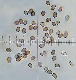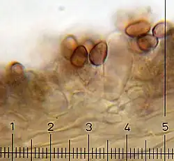 The spore print is dark purplish brown. Spores are rhomboid or nearly so in face view, and more or less ellipsoid when viewed from the side. They are thick-walled, with dimensions of 6.5–4–5.6 μm, and feature a broad germ pore. The basidia (spore-bearing cells) are usually four-spored, hyaline (translucent), roughly cylindrical or with a central constriction, and measure 12–22 by 5.5–9 μm. Pleurocystidia (cystidia on the gill face) are relatively abundant; they are ventricose (swollen), club-shaped or irregularly shaped, measuring 16–36 by 8–12 μm. The cheilocystidia (cystidia on the gill edge) are also abundant. They are 19–35 by 4.4–6.6 μm, lageniform (flask-shaped), narrowing into a long neck with a width of 1–3 μm, and either acute or somewhat capitate (ending in a roughly globular tip). Clamp connections are present in the hyphae.[1]