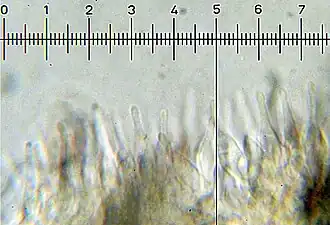 | Spores are rhomboid to ellipsoidal depending on the direction in which they are viewed. | Cheilocystidia are flask-shaped with a long neck. | A swollen pleurocystidium is visible between two basidia with spores still attached. | |||||||||||||||||||||||||||