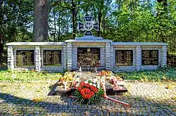During the German invasion of Poland, which started World War II, fighting occurred in the surroundings of Pszczyna, which can be seen by observing the leftovers of concrete strongholds around the town. In that area, the Battle of Pszczyna took place on September 1–2, 1939, where German forces breached main Polish defensive lines protecting the Silesian area. On September 4, in the local park, the German Freikorps murdered 14 Poles who had taken part in the defense of nearby Katowice (13 boy scouts and one school teacher).[9] They were buried in the nearby forest in an unmarked mass grave. Poles arrested during the Intelligenzaktion, aimed at the extermination of the Polish intelligentsia, were imprisoned in a local court prison, and then deported to concentration camps.[10]