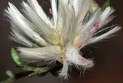 Ptilotus divaricatus, commonly known as climbing mulla mulla[2] is a species of flowering plant in the family Amaranthaceae and is endemic Western Australia. It is a prostrate to scrambling shrub with linear stem leaves and oval, hemispherical or spherical clusters of white or pinkish-purple flowers.