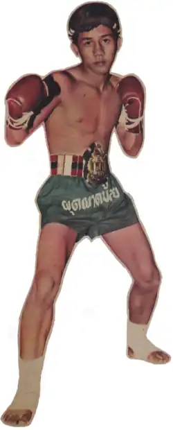 Ponn Ommklin started Muay Thai at the age of 14 in his native province of Khon Kaen, following the steps of his older brother. His parents wouldn't let him pursue Muay Thai full time before graduating high school which he did in 1969. During that period Pudpanoi competed in Isan over 60 times and went undefeated. At the age of 18 he went to Bangkok on the advice of a fighter from the Worawut camp. On this occasion Pudpadnoi used his famous ring name for the first time as he won his debut in Rajadamnern Stadium by high kick knockout.[2] During his first two years of competition in Bangkok Pudpadnoi won 17 of 19 fights. He was a very versatile southpaw with powerful kicks earning him the nickname "The Golden Leg".[3]