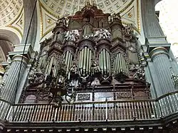 The cathedral in Puebla had a distinguished musical tradition, dating from the late sixteenth century.[11][12] One of the most distinguished musicians was Juan Gutiérrez de Padilla, active as chapel master from 1629 to 1664. His wrote extended and complex works, including polychoral masses as well as villancicos (for the Christmas season). His music shows between others the evidence of New Spain's non-white population in tocotines (Nahua influence) and negrillos and porto ricos (African influence). The cathedral has extant choir books of his compositions. His villancicos "stand as one of the greatest contributions to American music history."[13]