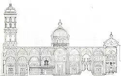 The space it occupies is rectangular in shape, recharged in the corner of another larger floor, forming a large space for the atrium. The building is organized into five naves: a central one, two lateral ones and two niche chapels, its Renaissance-style façade stands out. Attached to its back is a building for offices of the Mitra, its former headquarters, and the building of the chapel called Ochavo. With its little more than 70 meters high, it was the tallest church in the Spanish colonies.