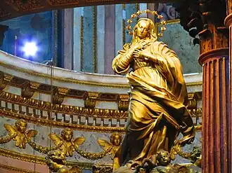 The side portals both show a relief with its Villería frames, on the left it represents Saint Rose of Lima receiving roses from the Virgin and a shield that says (Cordis mei rosa) Rose of my heart, and on the right Saint Teresa of Ávila in the moments in which an angel wounds her with an arrow in the heart (religious ecstasy), the shield on her left says (Vulnerasti cor meu) you hurt my heart and the one on her right (Amore langueo) consumes me of love.