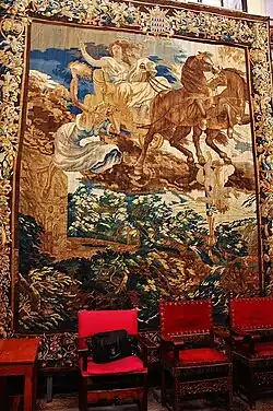 In this room, 4 tapestries (Gobelins) from Greek mythology shine in all their magnificence, representing Queen Hippolyta of the Amazons on the banks of the Termodont who was defeated by Heracles, the chariot of the aurora excels as a nurse of nature and the encounter of Thalestris and Alexander the Great Generalissimo of the Hellenes. The last gobelin is the embarkation of the Argonauts in search of the golden belloniso, they come from the French manufacture of Jean Gobelin of the fifteenth century, brought by the Spaniards.