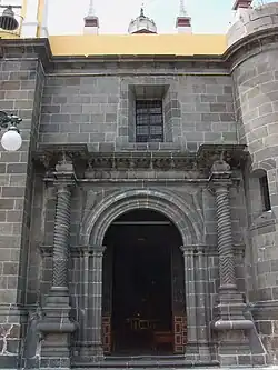 The Norte and Sur portals are similar in architecture although they vary in details, the Sur being simpler without statues or decorations, the latter is located in front of the Casa de la Cultura, former Seminary, and its atrium is only as wide as the portal because it is boxed in on both sides by constructions of the same church. The grille of this access was built by José Mariano Saavedra. It was opened to the public in September 2010 after having been closed for more than 50 years.