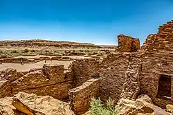 Spaces were generally divided into four sections aligned with the cardinal directions, which held religious significance. The great houses at Pueblo Alto were aligned along a north–south axis.[4] Entrances to structures were generally south or southeast facing.[2][4] This provided shade from summer sun and warmth from winter sun.[2] The back of the buildings were joined together with a large wall to provide shelter from wind.[4] At the center of the structure was a plaza, meant to serve as a community center.[4] Great house complexes are also characterized by earthen berms and formal road segments.