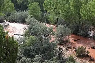 The intermittent river is the main tributary of the Little Colorado River, which is a tributary of the Colorado River. It drains an area of about 2,654 square miles (6,870 km2) and is 167 miles (269 km) long.[3] The river's average discharge is very low, less than 70 cubic feet per second (2.0 m3/s) in normal years, because its drainage basin is extremely dry. For most of the year, the Puerco River is a braided wash containing little or no water, although large flash floods can occur in downpours.