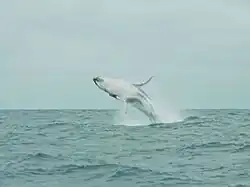 40 kilometres offshore is Isla de la Plata (named from its history as a pirate hideout, the Island of the Silver), also referred to as "The Poor Man's Galapagos."[2] There some species that also inhabit the Galapagos like the blue and red-footed booby, nazca booby, frigatebirds, albatross, pelican and other seabirds that are nesting in colonies can be found. The island is surrounded by coral reef and snorkeling is a popular activity. On the boat ride from Puerto Lopez to the island pods of dolphins can often be seen.