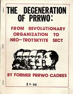 The PRRWO represented a significant shift from the YLP. While the YLP was a popular, community-focused radical group, the PRRWO was a more strictly ideological organization.[15] As a result, the PRRWO closed its community offices and reduced public engagement, emphasizing the importance of study circles.[11] This caused membership to decline to fewer than 100 members, per an estimate by researchers Aaron J. Leonard and Conor A. Gallagher.[16] The atmosphere in the organization was one of distrust, and members were regularly accused of being agents of the Federal Bureau of Investigation (FBI). These members were then purged from the organization in what historian Johanna Fernández describes as "show trials".[17]