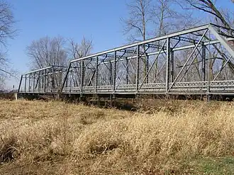 Pugh Ford Bridge, also known as Bartholomew County Bridge No. 73, is a historic Pratt through truss bridge spanning the Flatrock River at Flat Rock Township and German Township, Bartholomew County, Indiana. It was built by the Elkhart Bridge and Iron Co. and built in 1911. It consists of two spans, with each measuring 128 feet long. It rests on concrete abutments and a concrete pier.[2]: 5