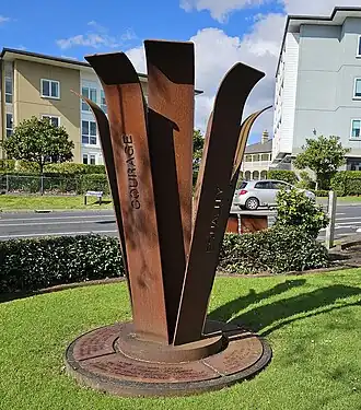 The memorial was commissioned by the Puketāpapa Local Board and Auckland Council, designed by artists Matthew van Sturmer and Carmen Sosich and constructed by MvS Studio.[2] The design is an abstract depiction of the camellia, which was a symbol of the suffrage movement in New Zealand in the nineteenth century. The base of the flower is inscribed with the names of the local women who signed the 1893 petition to Parliament requesting the vote for women.[3] A nearby plaque records the names of Mt Roskill women who have been elected to local and central government, including former prime minister Helen Clark.[3]