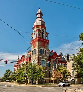 The Pulaski County Courthouse is located at 405 West Markham Street in downtown Little Rock, Arkansas, the state capital and the county seat of Pulaski County. It is set among a number of other state and city government buildings, on a city block bounded by West Markham, Spring, West 2nd, and South Broadway Streets, with a county park occupying the western portion of the block. The courthouse has two portions: an elaborate Romanesque edifice built of stone and brick in 1887–89 to a design by Max A. Orlopp, and a large four-story Beaux Arts annex designed by George Mann and added in 1913–14. The annex is acknowledged as one of Mann's most successful commissions.[2]
