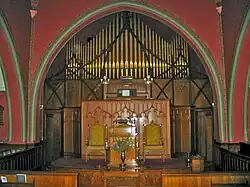 When the interior carpentry and plastering finished the church was ready for the pipe organ. The organ, from the Johnson Pipe Organ Company, Westfield, Mass., arrived in early November; company workmen spent the rest of the month installing it. As soon as the organ was installed workmen from Tiffany's workshop in New York City arrived to paint the walls and ceilings with the special "Tiffany blend," which modulated from terracotta on the walls to gold on the ceiling,[11] and installed the fifty-six colored glass windows.