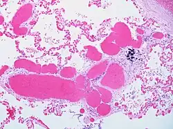 - ^ a b c Guzman, Samuel; Khan, Mohammad S.; Chodakiewitz, Yosef; Khan, Maham; Chodakiewitz, Michael S.; Julien, Peter; Luthringer, Daniel J. (2019). "Pulmonary capillary hemangiomatosis: a lesson learned". Autopsy and Case Reports. 9 (3). Editora Cubo: e2019111. doi:10.4322/acr.2019.111. ISSN 2236-1960. PMC 6709648. PMID 31528628.