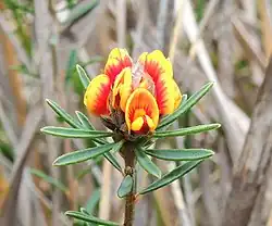 Pultenaea dentata, commonly known as clustered bush-pea,[2] is a species of flowering plant in the family Fabaceae and is endemic to south-eastern Australia. It is an erect to low-lying or prostrate, open shrub with elliptic to narrow egg-shaped leaves and dense clusters of yellow, red and purple flowers.