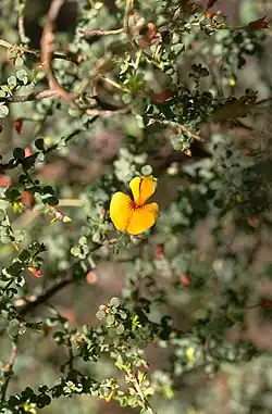 Pultenaea patellifolia, commonly known as Mt Byron bush-pea,[2] is a species of flowering plant in the family Fabaceae and is endemic to the Black Range in the Grampians National Park in Victoria. It is a spreading shrub with round leaves, and clusters of yellow and red, pea-like flowers.