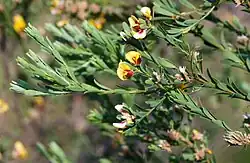 Pultenaea platyphylla, commonly known as flat-leaf bush-pea,[2] is a species of flowering plant in the family Fabaceae and is endemic to south-eastern continental Australia. It is an erect, rigidly-branched shrub with narrow egg-shaped to wedge-shaped leaves with the narrower end towards the base, and yellow to orange and red to purple flowers.