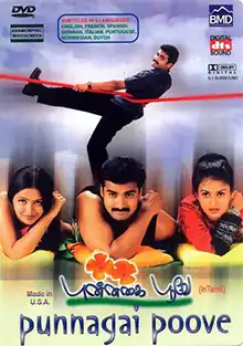 Punnagai Poove (transl. Smiling Flower) is a 2003 Indian Tamil-language romantic drama film directed by Sabapathy Dekshinamurthy and written by R. N. R. Manohar, starring Nandha, newcomer Rekha Vedavyas and Kaveri. Vadivelu, Senthil and M. S. Viswanathan appear in supporting roles, whilst actress Sarika, ex-wife of Kamal Haasan, makes a comeback to Tamil films after 17 years, and music composer Yuvan Shankar Raja, who scored the music for this film as well, makes special cameo appearances in the film.[1][2]