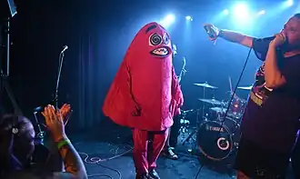 ![]() Purple City mascot Nurple joins the hardcore band Vibes on stage at Temple, 25 August 2023. | |