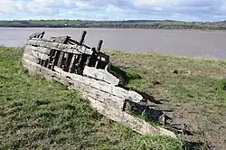 In 1909, following a collapse in the bank of the river,[12] the canal company's chief engineer Mr A. J. Cullis called for old vessels to be run aground along the bank of the Severn, near Purton, to create a makeshift tidal erosion barrier to reinforce the narrow strip of land between the river and canal.[13] Barges, trows and schooners were "hulked" at high tide, by towing them from the dock at Sharpness and releasing them to be carried up the bank on the tide. Holes were then made in their hulls so that they filled with water, and over time silt has been laid down inside them.[13]