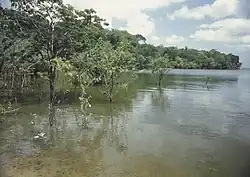 The floodplain holds aquatic vegetation where drainage is poor, successional vegetation, forest mosaics and permanent swamp vegetation.[2] The várzea forests holds more species than várzea on the lower Amazon, but fewer species than in the surrounding terra firme forests. The forest is continuous. The rich understory includes plants of the families Zingiberaceae, Marantaceae and Heliconiaceae.[2] Economically valuable timber trees include Carapa guianensis, Iryanthera surinamensis, Ceiba pentandra and Calycophyllum spruceanum. On the upper levees the most common trees are Ceiba pentandra, Hura crepitans and Parinari excelsa. On the lower levees common trees include Pterocarpus santalinoides, Eschweilera albiflora, Piranhea trifoliata and Neoxythece elegans.[2]