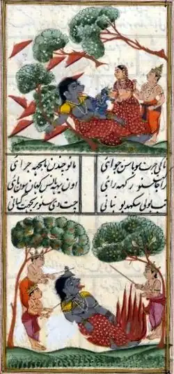 Putana, the "killer of infants", was sent by Krishna's evil uncle Kamsa to kill Krishna. Putana assumed the disguise of a young, beautiful woman and came to Gokul (Vraj), Krishna's home-town. Her beauty resulted in her being mistaken by gopas (cowherds) as a manifestation of goddess Lakshmi. Stunned by her beauty, Krishna's foster-mother Yashoda allowed Putana to take the infant Krishna into her lap and breast-feed him. Putana had smeared her breast with a mandana, an intoxicant, to kill Krishna. However, Krishna squeezed her breasts and took her life away (prana), as well as her milk. In pain, Putana screamed, pleading for her release, but in vain. She ran out of the town with Krishna still clinging to her and finally fell dead. She then assumed her real demonic form, turning trees to a distance of three gavyuti (a unit of distance equivalent totally to 12 miles) to dust.[6][7] The people of Vraj cut Putana's body, burying her bones and feet and burning the flesh and skin. The fragrant smoke rose out of the flames, as Putana was cleansed of all sin by breast-feeding Krishna and she attained the same heaven that Yashoda acquired.[6] Thus, Putana, like Yashoda, is also considered as a foster-mother of Krishna as she breast-fed him.[8]