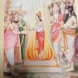 In the ancient Indian epic Ramayana, upon the recommendation of Sage Vashishta, King Dasharatha of Ayodhya performed the Putrakameshti Yajna under the supervision of Rishyashringa, an expert in Yajurveda, which has the guidelines for this yajna. After its successful completion, the god of fire, Agni, appeared and gave a bowl of payasam to the King of Ayodhya, which was provided to his three queens in order to promulgate his sons Rama, Lakshmana, Bharata, and Shatrughna.[2]