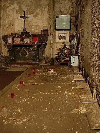 The putridarium is a temporary burial place, generally in an underground crypt, in which bodies, commonly of monks or nuns, can be stored in wall niches, often seated on masonry chairs with a central hole and vessel to collect the liquids of decomposition. Once the bodies have reached a proper stage of decomposition, the bones are collected, cleaned, and stored in an ossuary.