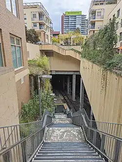 The railway cutting through Pyrmont is a two-track-wide, straight-sided excavation through the ridge of the peninsula from the commencement of Jones Bay Road, where the line deviated from the wharf sidings (now removed), through the current location of the John Street Square light rail stop. Approaching the stop, the line passes through a short tunnel under Harris Street. After the stop it enters a main tunnel near John Street opposite Mount Street. These tunnels are bored through the escarpment and are brick-lined. The tunnel exits near Jones Street at Saunders Lane and the line continues in a cutting which progressively opens out on the western side before falling ground levels bring the line on to a brick viaduct near where Jones and Allen Streets intersected before the railway was built. This heritage-listed viaduct continues across Wentworth Park towards Glebe. The railway cutting is through Pyrmont sandstone.[4]