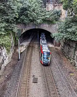 The Glebe railway tunnel runs approximately 800 metres (2,600 ft) from Lower Avon Street, Glebe (adjacent to the metro light rail Glebe stop) to Jubilee Park. Tunnel openings at the east and west end are built of brick in an English bond pattern, with the arch formed by bricks laid in soldier course, and featuring a sandstone keystone. The tunnel supports a double track currently used by the light rail system. The tunnel is approximately 8.3 metres (27 ft) wide and 5.9 metres (19 ft) high.[5]