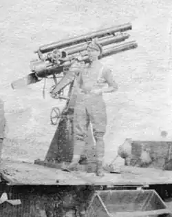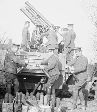Elswick Ordnance had already developed the gun as a commercial venture and supplied the existing 6 guns to the British government in 1915 when the need for anti-aircraft guns became urgent.[2] All 6 were eventually sent to the Western Front and then various other theaters. Precise theaters of service are difficult to ascertain due to writers often not differentiating between various Mks of 13-pounder guns. 2 guns are known to have been operated by 99th Anti-Aircraft Section at Salonika from July 1917 until the end of the war.[3]