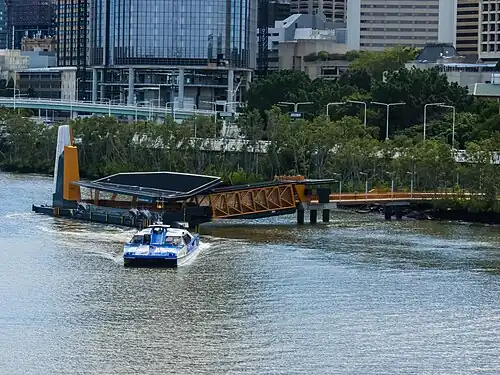 The wharf was destroyed during the January 2011 Brisbane floods.[3] A temporary replacement opened on 18 April 2011.[4][5] The temporary wharf closed in early 2015 to allow a new permanent wharf to be built. The new wharf opened on 24 April 2015.[6] The terminal was damaged in the 2022 eastern Australia floods and reopened on 1 November 2022.[7]