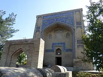 Qaffol Shoshi mausoleum (Uzbek: Qaffol Shoshiy maqbarasi) is a mausoleum in Tashkent, Uzbekistan, built in honor of Imam Abu Bakr Muhammad ibn Ali ibn Ismail al-Kaffal ash-Shashi.[1][2][3] The original tomb did not survive in its initial form. In its current state, the mausoleum was constructed in 1542 by the royal architect of that time, Gulyam Husayn. It is an asymmetrical domed portal mausoleum, known as a khanqah.[4] Khanqahs were designed to provide pilgrims shelter in residential places called “khujrahs”.[4] Mausoleum complexes often included a mosque and a kitchen.[1][5][6] To the south of the main building in a small courtyard, there are later burial places (saganas).