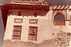 A view of the facade of one of the remaining houses from Qatif Castle, highlighting the architectural decorations alongside the neglect that has contributed to its deterioration.