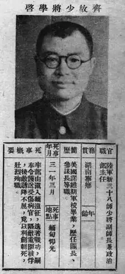 Qi Xueqi (Chinese: 齊學啟; pinyin: Qí Xuéqǐ; August 28, 1900 – March 8, 1945) was an anti-Japanese commander of the Kuomintang (KMT).