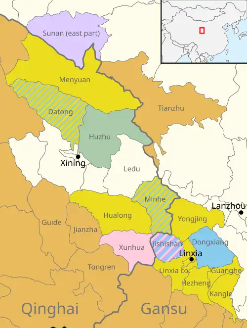 The Qinghai–Gansu sprachbund or Amdo sprachbund is a sprachbund in the plateau traversed by the upper Yellow River, including northeastern Qinghai and southern Gansu. This has long been an area of interaction between speakers of northwestern varieties of Mandarin Chinese, Amdo Tibetan and Mongolic and Turkic languages.[1] These families feature contrasting typologies, which spread between languages in the region.[2] The languages have come to share many features, and differ significantly from their relatives outside the region.[3]