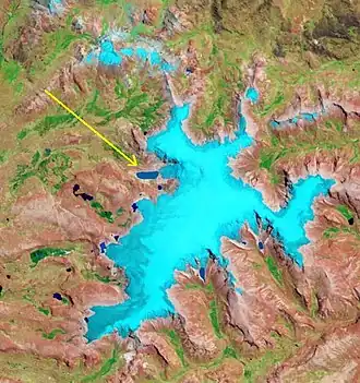 Beginning in 1991, a proglacial lake started to form where the glacier once existed. The lake is extremely deep, and is contained in a natural valley which acts as a dam.[5] In 2004, the lake had reached a depth of 80 meters.[6]