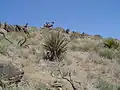 Quail Mountain was previously covered with old-growth California juniper (Juniperus californica) and Single-leaf Pinyon (Pinus monophylla), Joshua tree (Yucca brevifolia), and Coastal sage scrub oak (Quercus dumosa) woodland. Several wildfires burned over the mountain, leaving it very barren of taller woody plants, which continues while their slow natural regeneration occurs. There are occasional Pinyon pines and California junipers that survived, and they are the source for new generation.